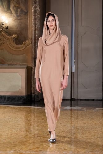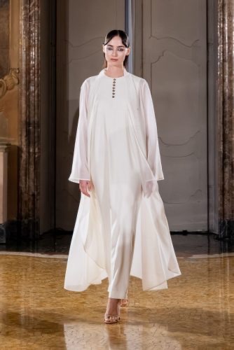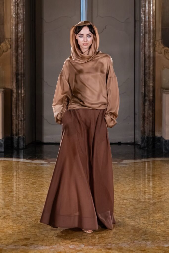 مستوحاة من المناظر الطبيعية الخلابة في قطر، تُستحضر لوحة الألوان درجات ألوان الصحراء الهادئة – العاجي، والأزرق السماوي الناعم، والرملي، والألوان الترابية. تلعب الإكسسوارات دورًا حيويًا في سرد القصص: الجوارب والقفازات المزينة ببلورات وردة الصحراء، والحجابات الشاشية الناعمة، ولمسات رخام كارارا، واللمسات الذهبية، تُشيد بالتراث القطري وتُضفي لمسةً مميزة من الأناقة.