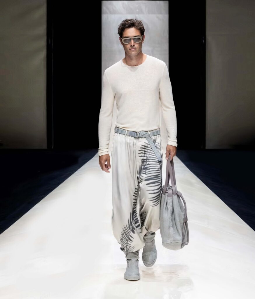T-Shirt أبيض بسيط تم تنسيقه مع سروال أبيض بطبعات زرقاء بسيطة لإطلالة غير رسمية أنيقة ومختلفة من تصميم Giorgio Armani – المصدر: Giorgio Armani