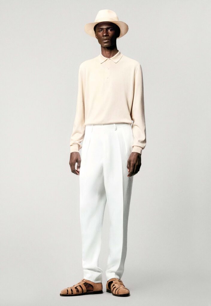 سروال أبيض كلاسيكي تم تنسيقه مع T-Shirt بلون عاجي بتصميم Polo من تصميم دار Loro Piana – المصدر: Loro Piana
