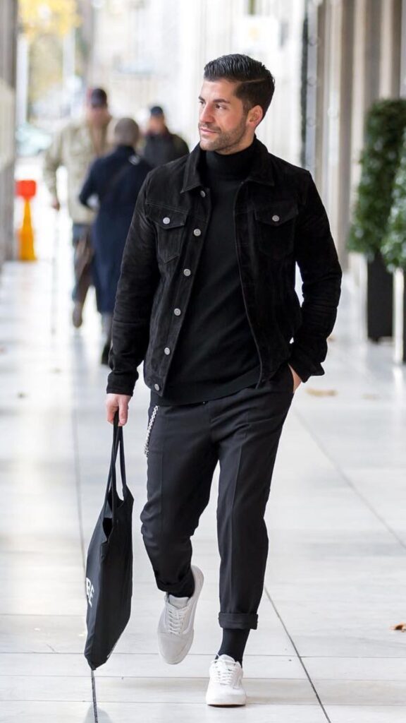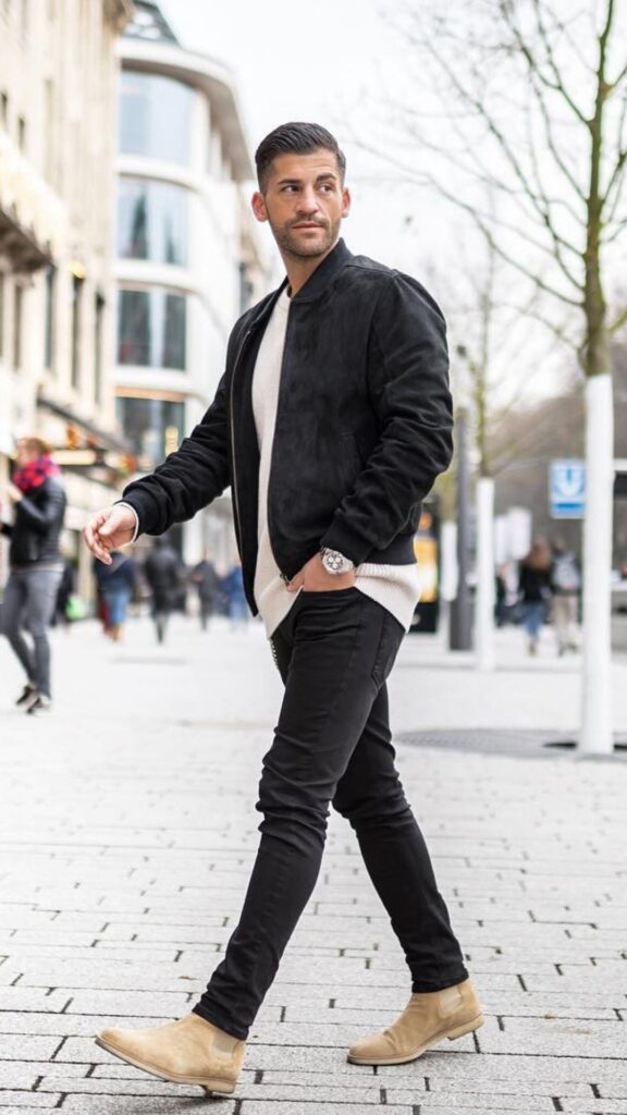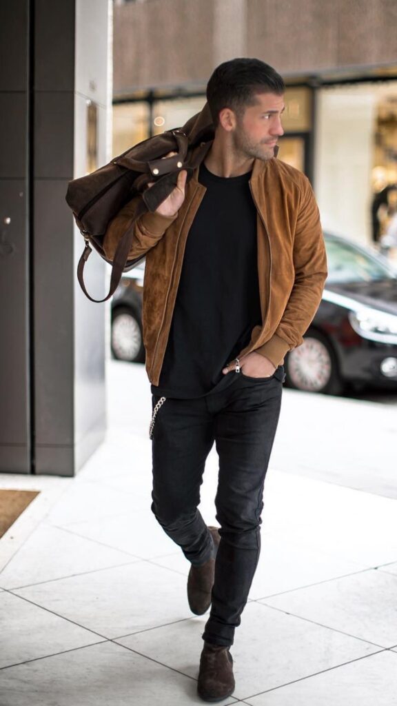 يمكنك أيضًا الاحتفاظ بأحذية الجلد المدبوغ في لوحة ألوان مماثلة، ربما بني غامق، إذا كنت ترغب في كسر اللون الرتيب بعنصر واحد فقط من المظهر – وهو في هذه الحالة سترة بنية اللون تبرز بلون أكثر حيوية قليلاً مقابل العناصر السوداء للمظهر.
