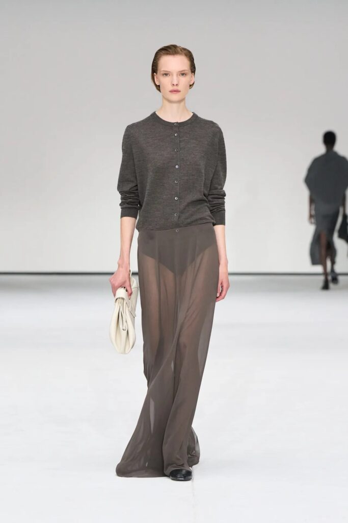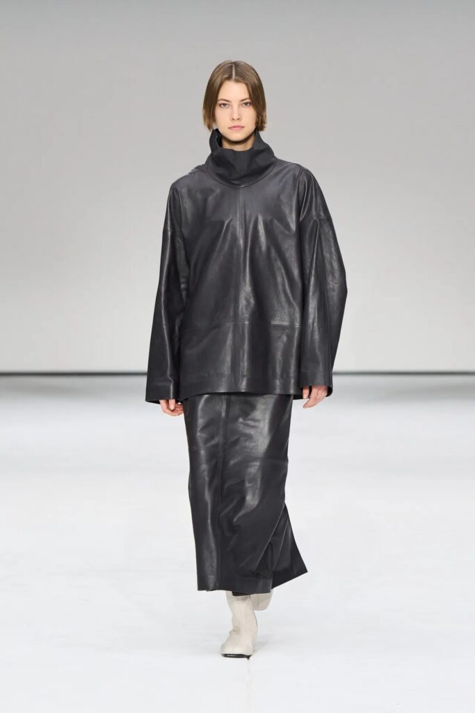 لطالما كانت التنورة الضيقة رمزًا للأناقة المهنية، لذا من المنطقي أن تضم المجموعة بعضًا منها، مُبرزةً إطلالات راقية وجريئة في آنٍ واحد. تميزت الإطلالتان الأوليان بتنانير ضيقة سوداء مصممة خصيصًا، مصنوعة من قماش مريح يسمح بالحركة مع كل خطوة. صُممت التنانير فوق منتصف الساق مباشرةً، لتُبرز حذاء الكاحل الجديد من العلامة التجارية ، والذي يتوق المطلعون على عالم الموضة للحصول عليه. تضمنت المجموعة أيضًا تنورة ضيقة جلدية وفستانًا رماديًا بتأثير مجعد، وكلاهما مُنسق مع بلوزات متناسقة، بالإضافة إلى قطعة صوفية مطبوعة بنقشة مربعات.