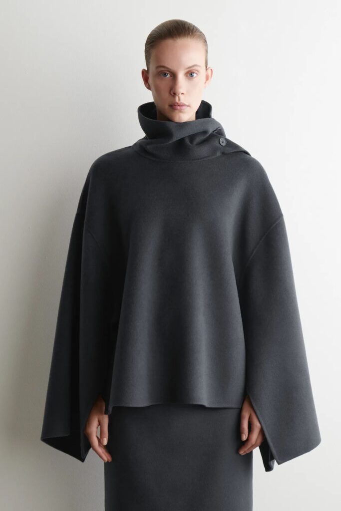 كما هو الحال مع معظم عاشقات الموضة حاليًا، نبحث دائمًا عن طرق لجعل إطلالاتنا تبدو أكثر أناقة ورقيًا. ومؤخرًا، اكتشفنا أن أسهل طريقة لتحقيق ذلك هي ارتداء بلوزات بياقة قمعية، وتوافقنا COS الرأي. وكما هو موضح في مجموعتها المعروضة، أُعيد تصميم بلوزات الجلد والعباءات الصوفية بياقات عالية تمتد لأعلى الرقبة، مما يُطيلها بصريًا ويمنحها مظهرًا أنيقًا وبسيطًا. كما لاحظنا بلوزات حريرية بأكمام قصيرة وبياقات عالية مريحة، حافظت على شكل الرقبة القمعية، لكنها تميزت بجزء أمامي منسدل قابل للطي، مما زاد من أناقة الإطلالة.